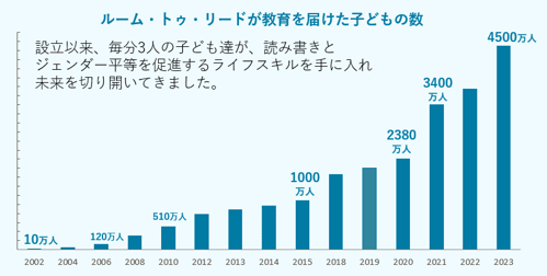 ルーム・トゥ・リードは長期計画『ビジョン2025』において、「2025年までに4,000万人の子どもたちに教育を提供する」という目標を掲げました。パンデミックの渦中においても、ラジオやテキストメッセージによる学習支援、デジタルライブラリー「Literacy Cloud」の提供、「She Creates Change」(邦題:少女達が未来を変えていく)を通じたジェンダー平等教育など、多様な手法で支援を継続し、累計4,500万人以上の子どもたちへの教育提供を達成しました。